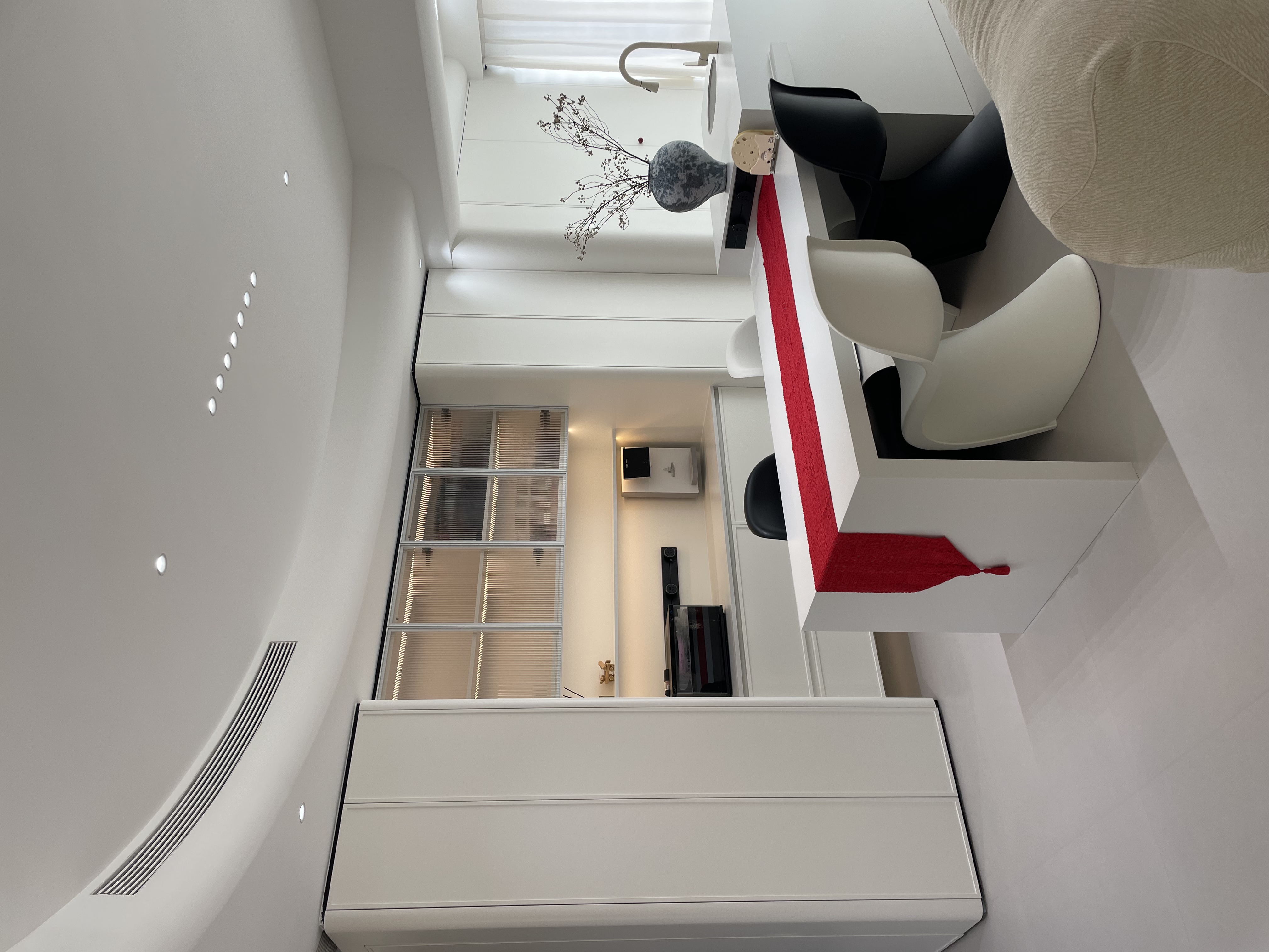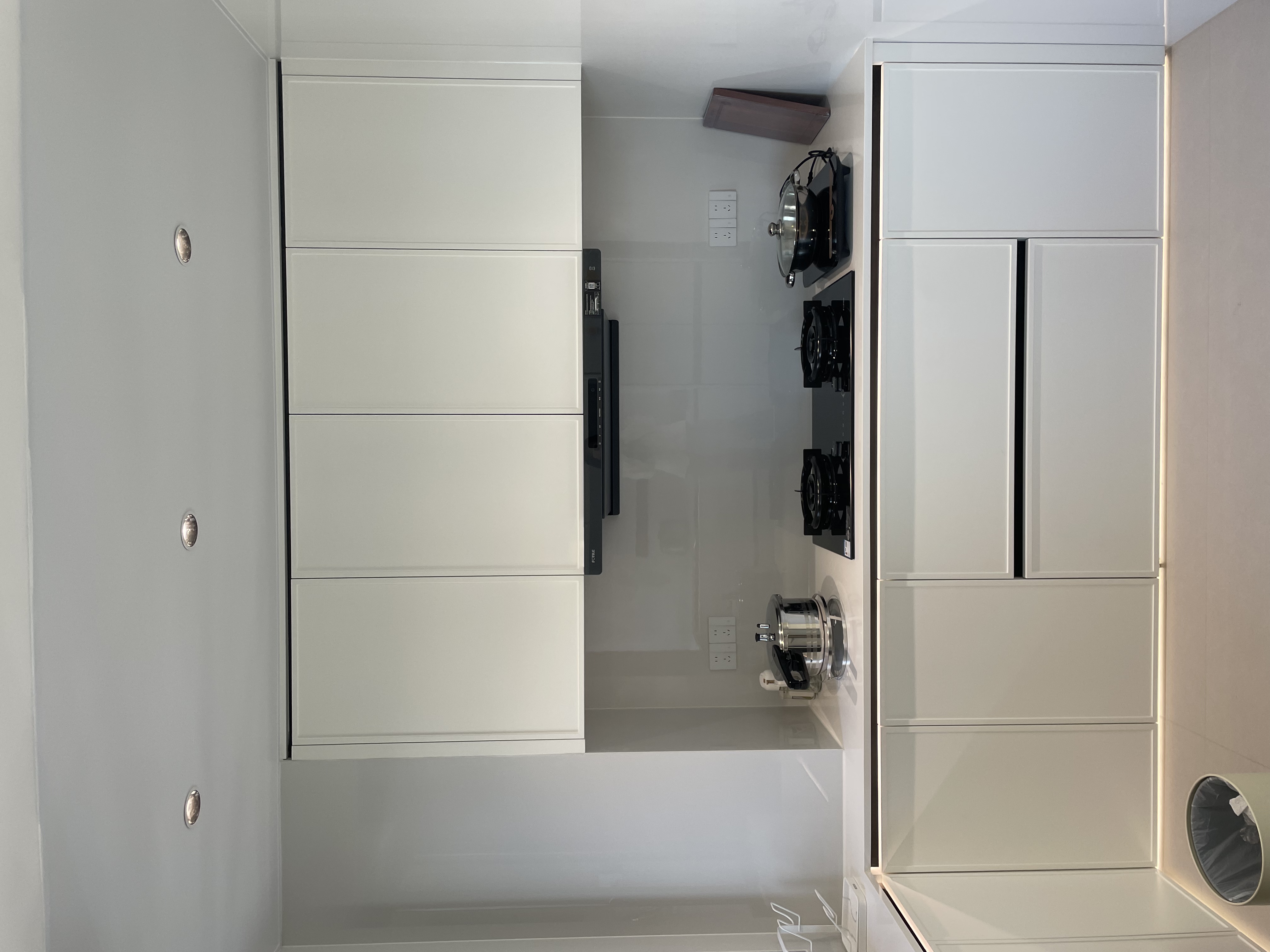 原先的餐厨区,设计师改造成一个可封闭可开放的大厨房,推拉门设计灵活切换开合状态。全白哑光柜体搭配奶油白柔光的亮面岩板,简洁又显质感。U型布局设计最大化利用空间,操作台延伸至窗边,采光绝佳,隐藏式冰箱与嵌入式家电让立面整洁统一,日光下,整个厨房干净且整洁。