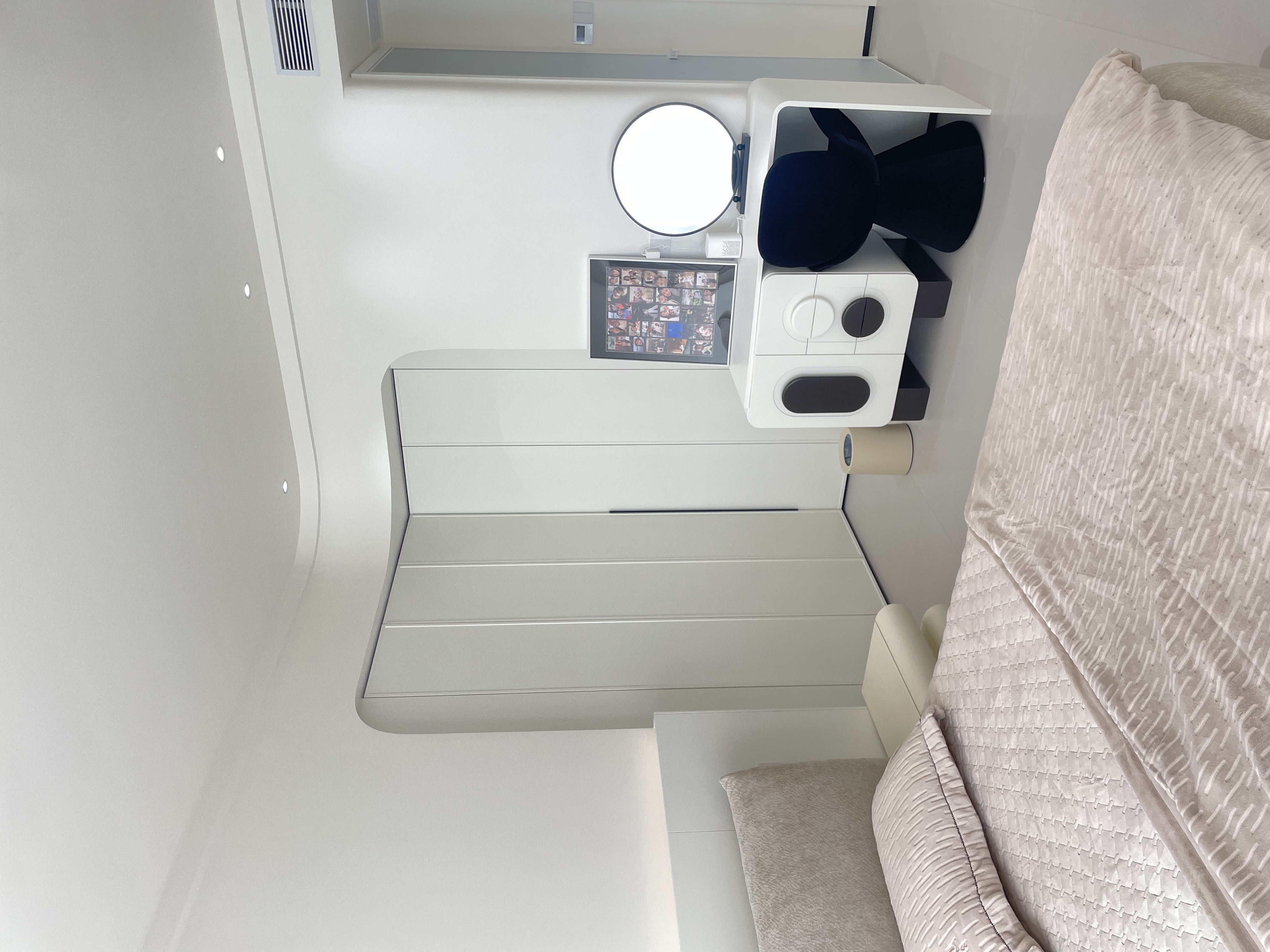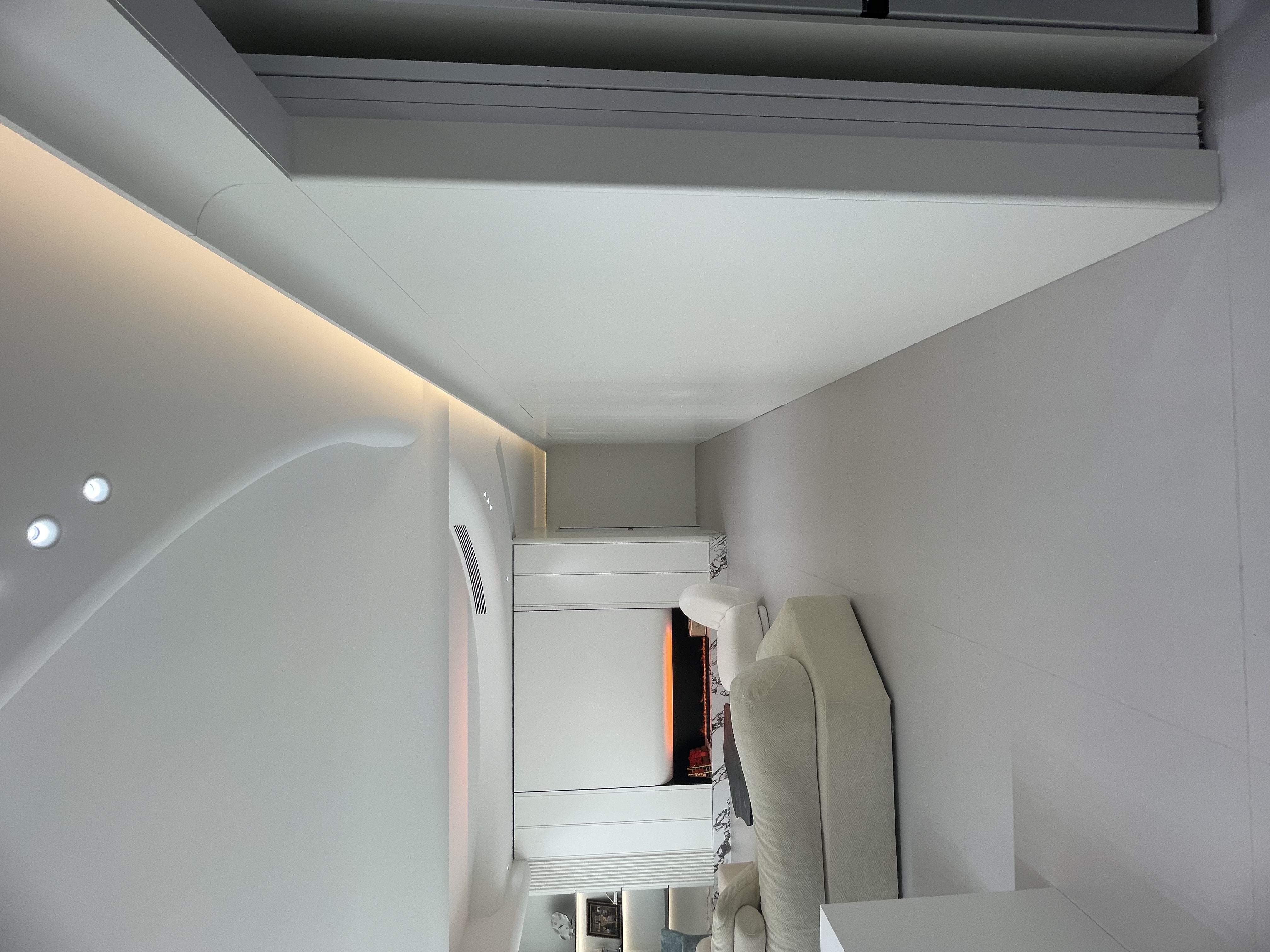 次卧的设计上,干净又通透。嵌入式衣柜与墙面、顶部空调出风口衔接得自然利落,相近的白色,弱化了柜体的厚重感。衣柜右侧暗藏灯带台面,既节省了空间,又做了功能延展。床品是浅灰纹理款,搭配深绿床背点缀质感,整体空间松弛且实用。