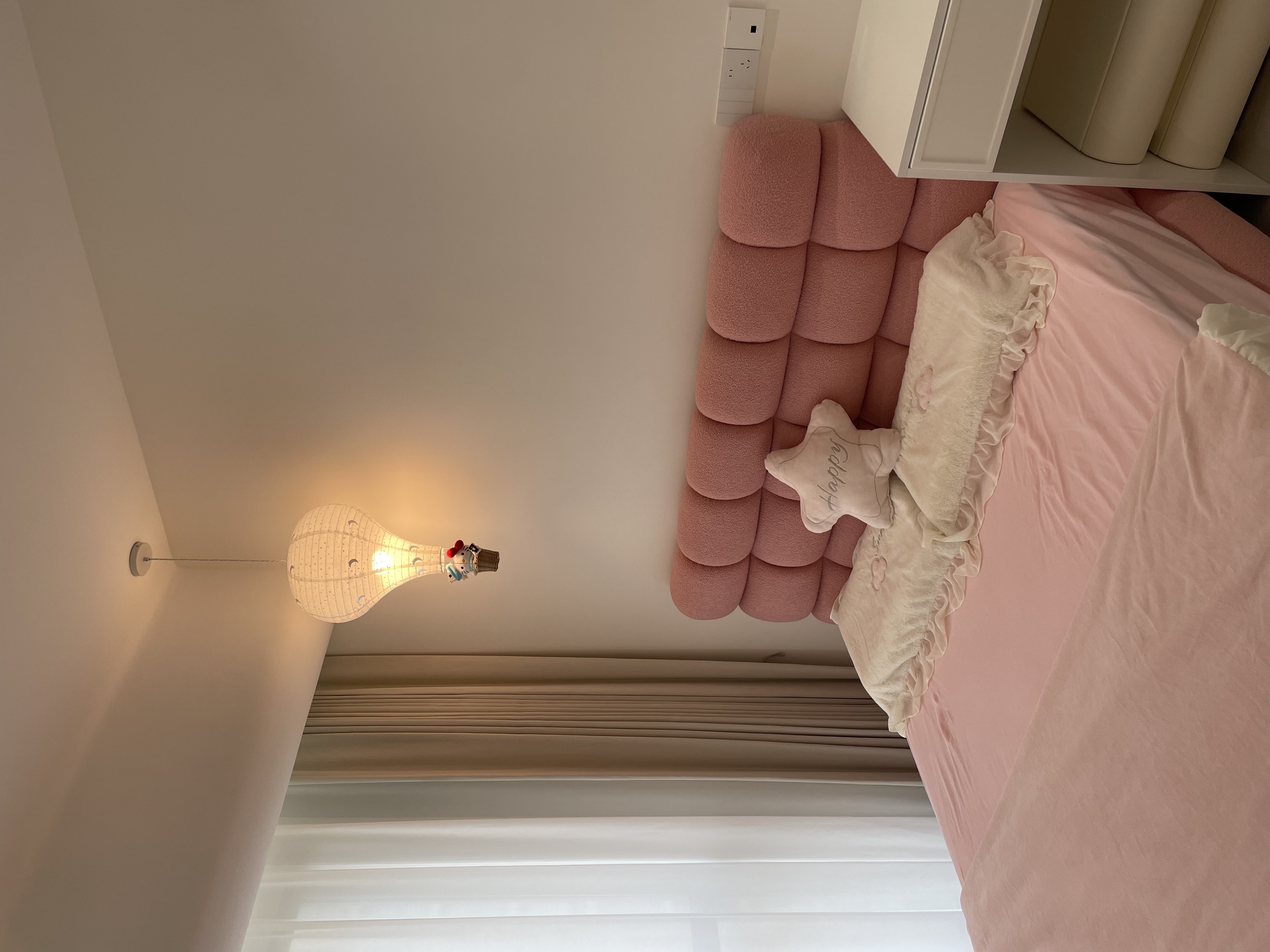 儿童房非常的萌趣十足,在硬装上仍然是以奶油色作为空间的基调,在床品的选择上,选择了儿童喜欢的柔和粉,让空间充满了童趣和温馨。