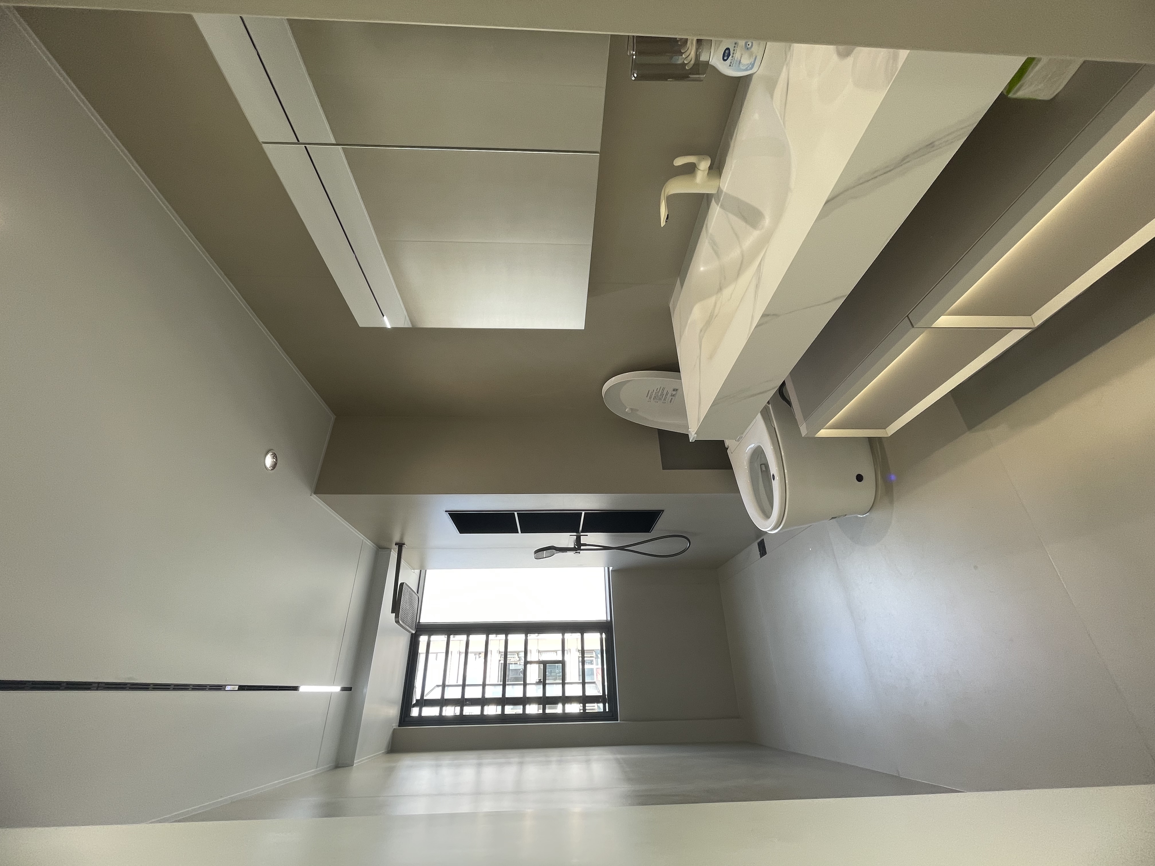 卫生间整体仍然是以奶油色作为空间的基调,空间呈一字形排开,依次是洗漱区、如厕区和淋浴区,洗漱区整体的设计非常大气简洁,通体设计的的洗漱台面外加整面的柜镜,大气简约。淋浴区域,结合空间的造型,还专门设计了壁龛,好用又时尚。